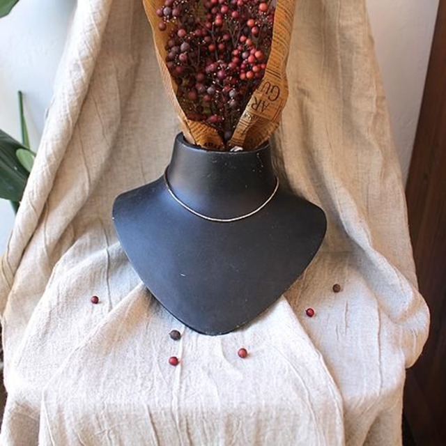 叩き出して作った2mmの銀の丸棒を曲げて、チョーカーにしました。 とても固く仕上がっていますので、細くても安心してお使い頂けます。 固くバネ性がありますので、後ろの開口部分を少し広げて首に装着してください。 銀棒の長さは約370mmです。 首が入る輪っかの直径はおおよそ120mm前後で 首周りの形に沿って立体的に造形されています。 (首周りの形は人によって大幅に違います。 形が合わない場合、ご自身で合う様に調整頂くことも出来ますが、 難しい場合は琉で調整いたしますので、ご相談ください。) ⚪︎素材について この商品はシルバー925で作られています。 ⚪︎サイズについて 銀棒の直径は約2mm、長さは約370mmです。 輪っかの直径はおおよそ120mm前後です。 ⚪︎刻印について チョーカーは刻印が出来ません。 ⚪︎納期について 写真の商品はサンプルになります。 ご注文をいただいてからの制作になります。 一点一点完全手作りのため、制作には約2週間程いただいております。 ⚪︎ラッピングについて こちらの商品は巾着袋に入れた後、説明書と共にダンボール箱に入れています。 それをエアパッキンで包み、各配送方法で使用する外箱に入れて発送致します。 (レターパックライトは厚み制限がありますのでこちらの商品ではご利用いただけません。) ⚪︎配送方法について ゆうパック:お届けの日時指定が可能です。指定した日時に郵便局員がお届け先の住所に直接配達いたします。商品の完成が近づきましたらメールにて連絡いたします。その際にご希望の配達日時をお知らせください。 クロネコヤマトの宅急便:ゆうパックと同様です。クロネコヤマトの配達員が配達します。 レターパックプラス:商品が完成次第お送りいたします。日時の指定は出来ませんが、郵便局員による直接手渡しの配達になります。
