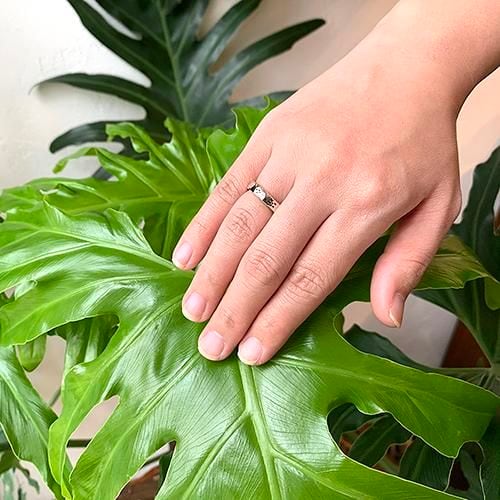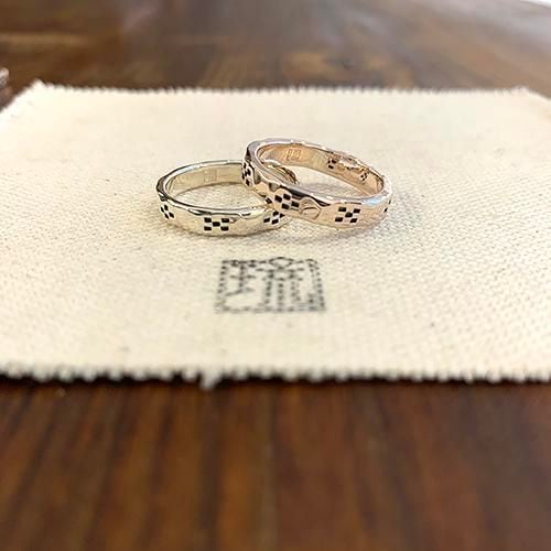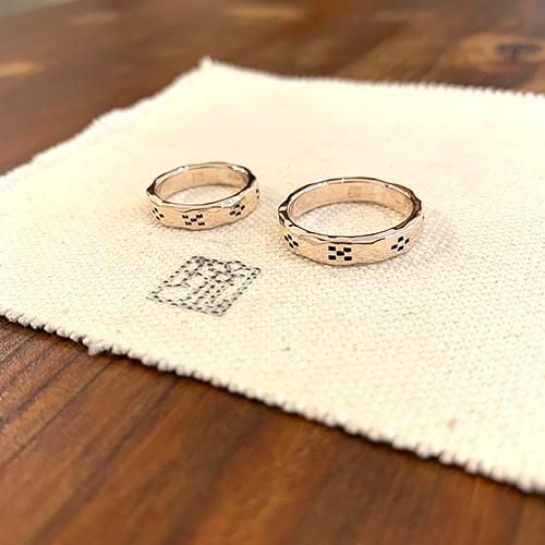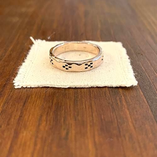 槌目のピンクシルバーにミンサー柄を一周八柄デザインしたリングです。