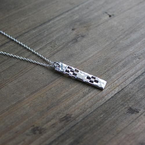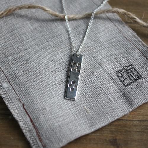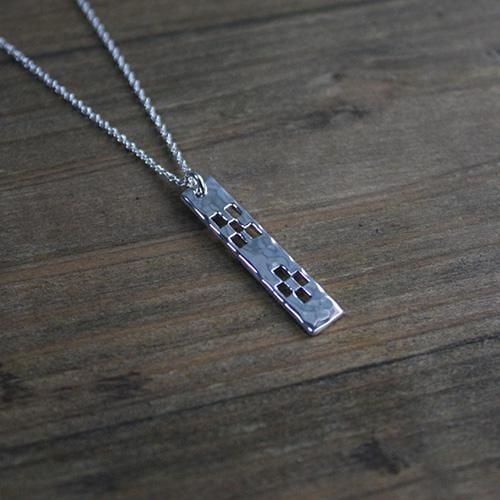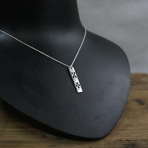 厚み約1.5mmの銀板から八重山ミンサー柄の形を一枚一枚切り抜いたシンプルなペンダントです。