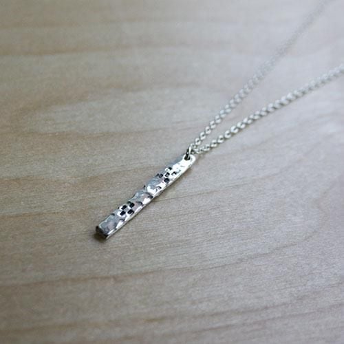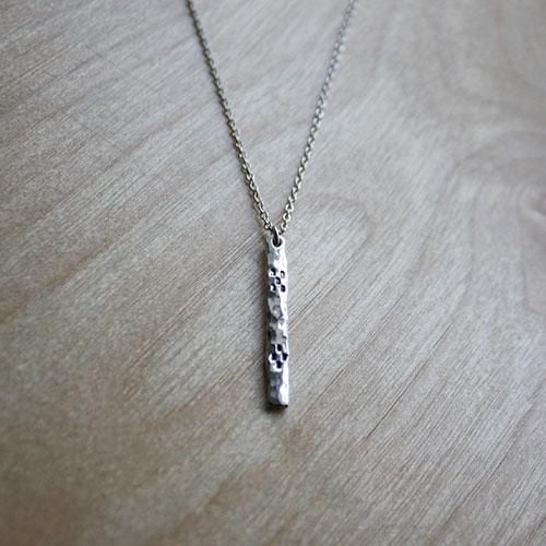 シンプルなストレート型ペンダントを槌目に仕上げ、ミンサー柄をデザインしたペンダントです。