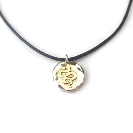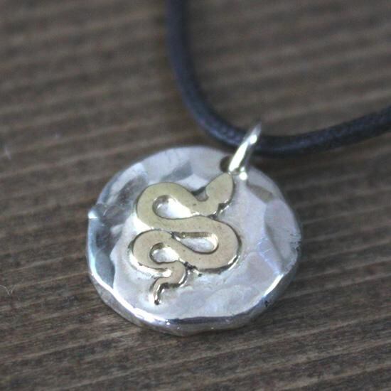 銀の塊から叩いて延ばしたコインの上に真鍮のヘビをロウ付けしています。