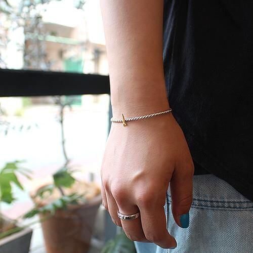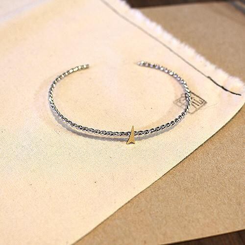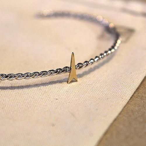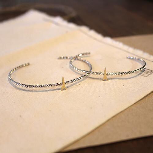 真ちゅうの板をトゥギャーの紋様に切り抜き1.2mmの銀線を捻って作ったバングルにロウ付けました。