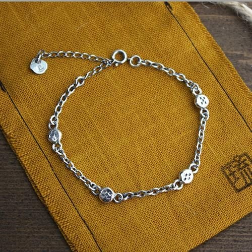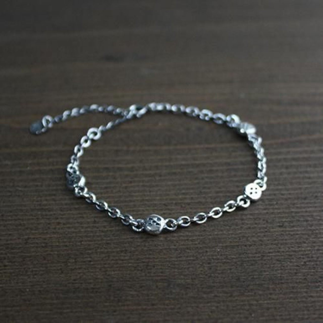粒状のビーズにミンサー柄の刻印を入れ、チェーンでつないだ二対、四柄のミンサー柄ブレスレットです。