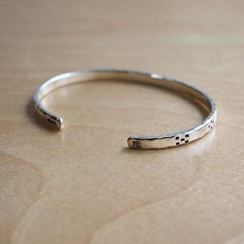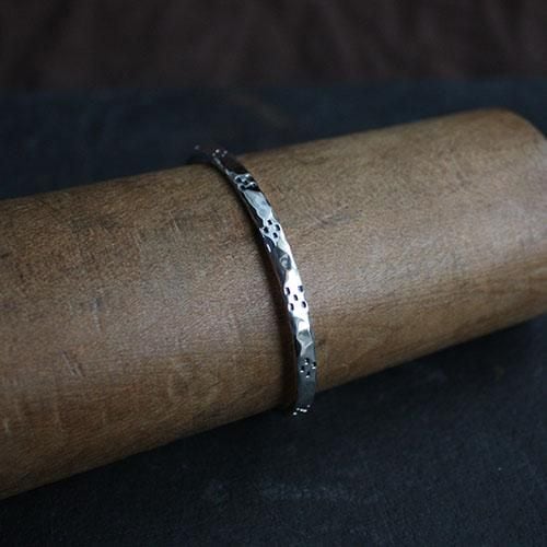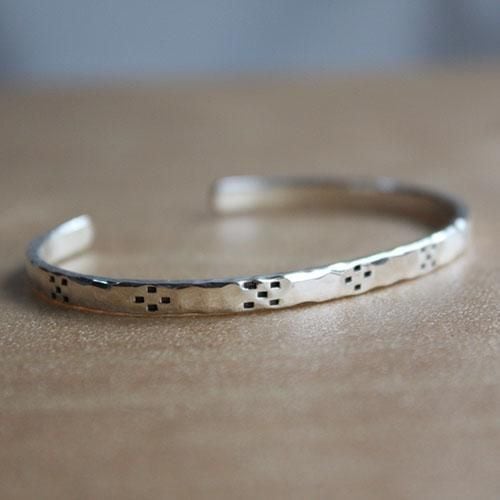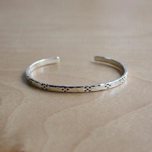 槌目のシルバーをそのまま磨き上げ、その上にタガネという道具を使いミンサー柄を表現した細身のバングルです。